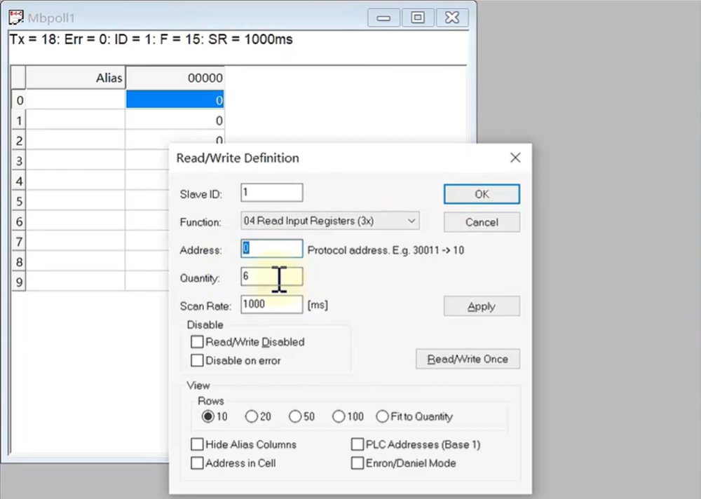 在Modbus Poll中的读写定义,功能码04,寄存器是从0开始的6个;