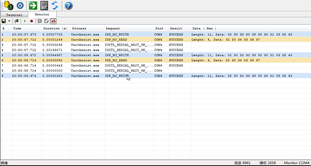 在它们通讯的同时,我们打开另一个串口监听工AccessPort工具,