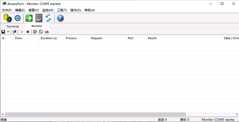如果没有数据的话,很有可能是由于次序弄错了,以本例为示例,要先启动AccessPort监听工具,并选择COM5,然后点击"开始监听";