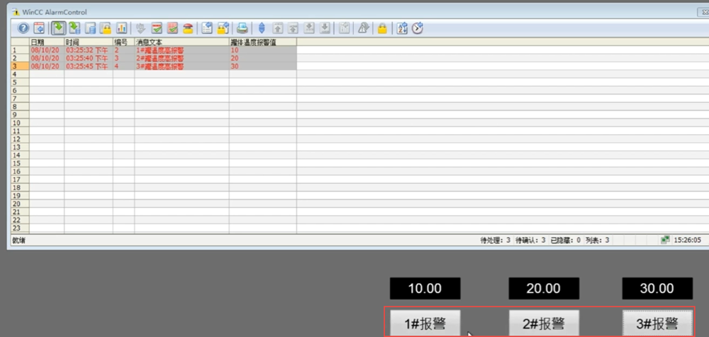 其中"1#报警","2#报警","3#报警",是下位机的一个二进制开关量,或者是一个变量的位;是在下位机中写好的,只需在上位机调用即可。