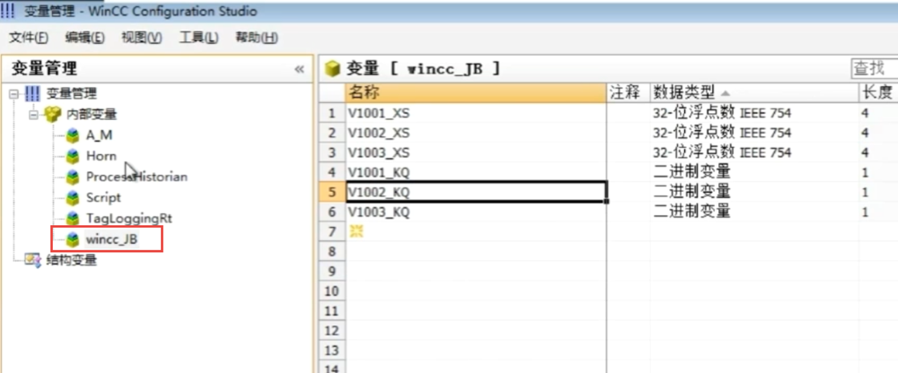 打开变理管理,在内部变量中新建几个变量做为测试,二进制的做为按钮来用,如超限触发的位,32位浮点数做为数据是个过程值,如压力、温度等;