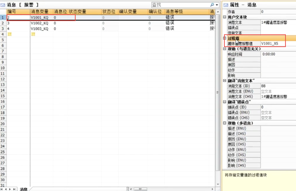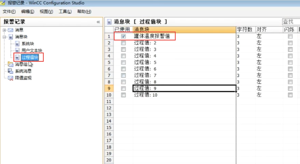 1、在消息块的过程值块中,将消息块命名为罐体温度报警值,并勾选"已使用";