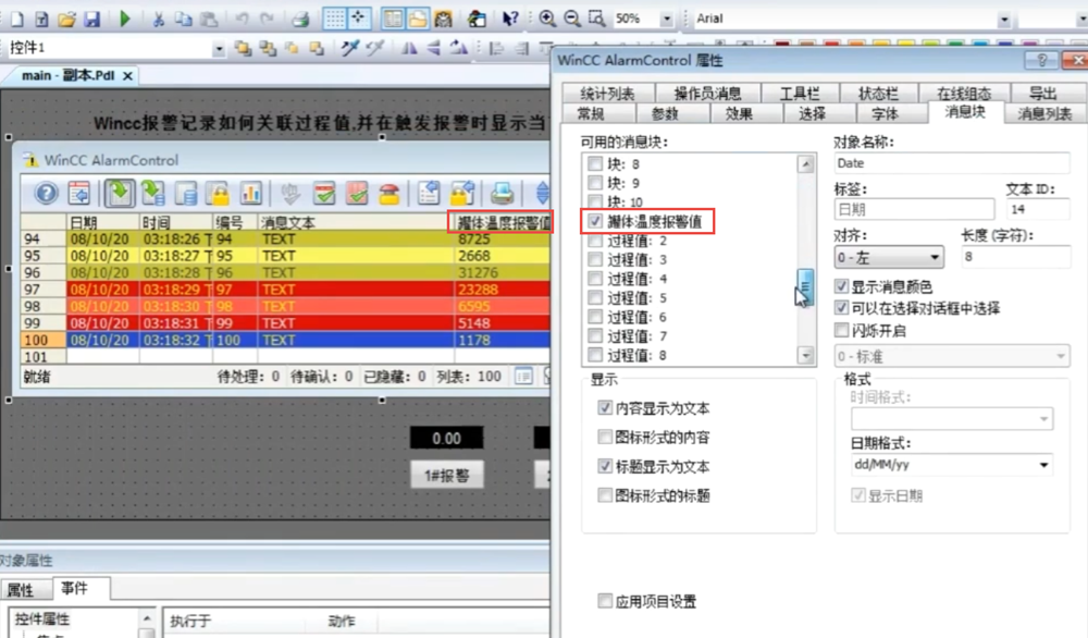 wincc报警记录如何关联过程值,并在触发报警时显示当前值
