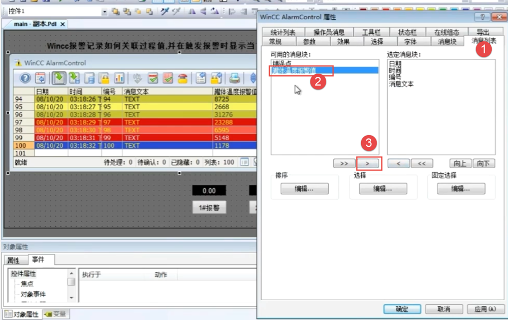 步骤三:如何将罐体温度报警值添加到Wincc AlarmControl列中。