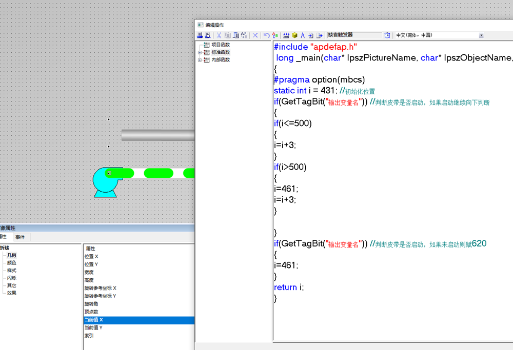 if(GetTagBit("输出变量名")) //判断皮带是否启动,如果启动继续向下判断
