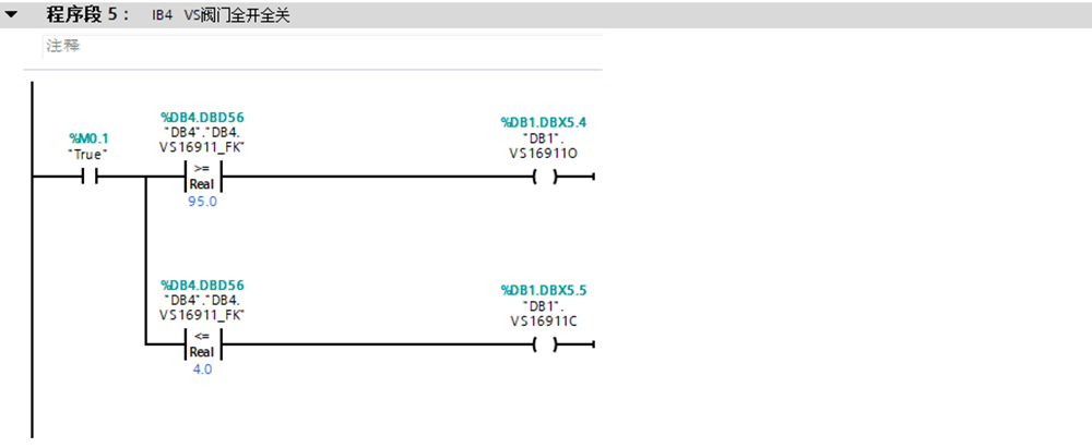 - 关闭VS阀VS16911的条件:处于手动模式;HMI中点击了关闭VS阀;DCS中没有点击关闭VS阀;OUTPUT_COMMAND_11【FC20】程序段13、16