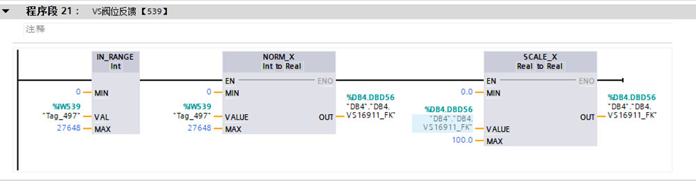 - VS比例阀的反馈539在AI【FC3】程序段21中实现 IW539来接收开度;SM1231模块的最后一个通道;倒数第二个模块。