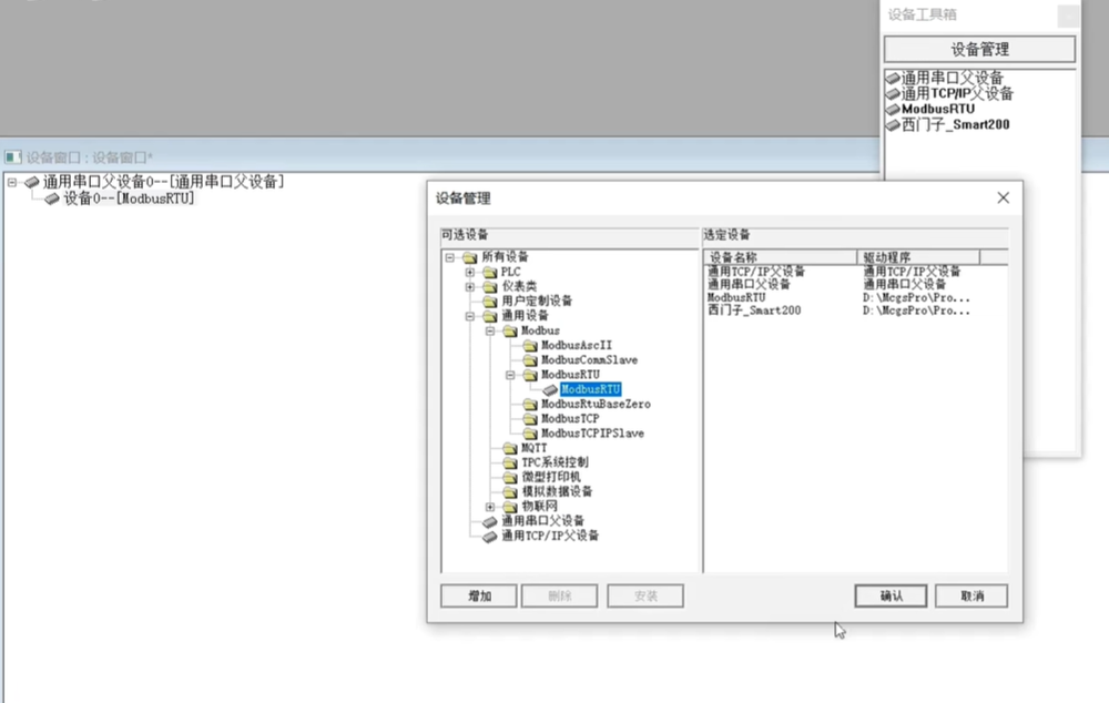 添加一个ModbusRTU设备,如果没有可以在设备管理中进行选择添加。