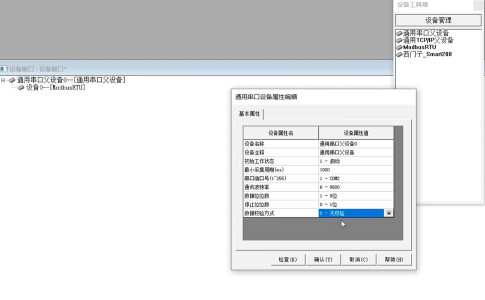首先在通用串口父设备0上右击查看其属性,串口端口号是HMI连接的哪个COM口,本例连接的是COM2;也就是默认的9600 8 N 1