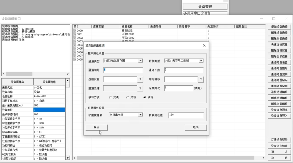 在设备0–[ModbusRTU]右击属性,设备地址就是从站地址,本例是从站1,然后再添加一个设备通道,无符号16进制,通道个数2,表示采集两个字,温度和湿度;
