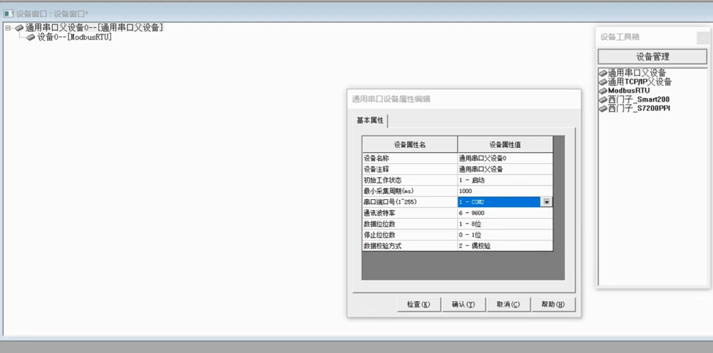 先添加一个通用串口父设备—–>再双击ModbusRTU这样就添加成功了。