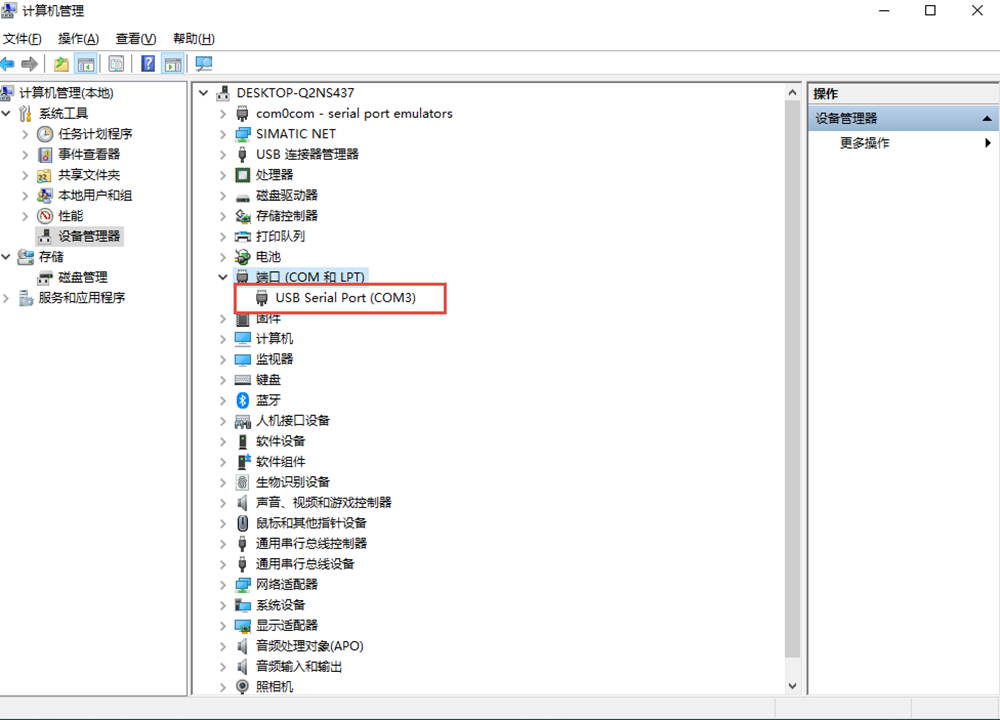 右击电脑,查看COM口,本例的是COM3,以实际的为准。