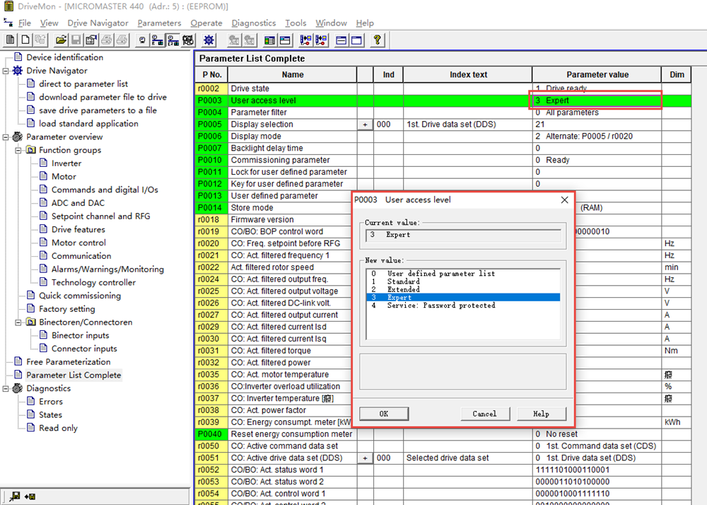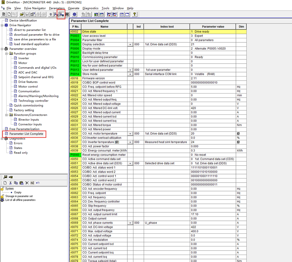 点击工具栏中的Online(Write EEPROM)进入在线状态。点击左侧对话框中的Parameter List Complete,右侧会显弹出变频器内设置的相关数据。此时就可以查看变频器的实时数据了。
