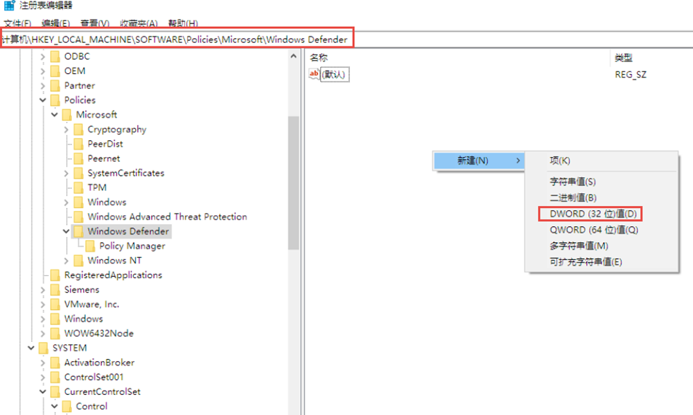 - 病毒和威胁防护经常自己打开,打开注册表:计算机\HKEY_LOCAL_MACHINE\SOFTWARE\Policies\Microsoft\Windows Defender在这个路径下新建建一个32位的值,并命名为DisableAntiSpyware