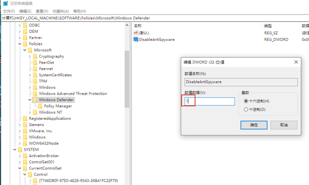 然后双击DisableAntiSpyware,将16进制的值改为1即可。
