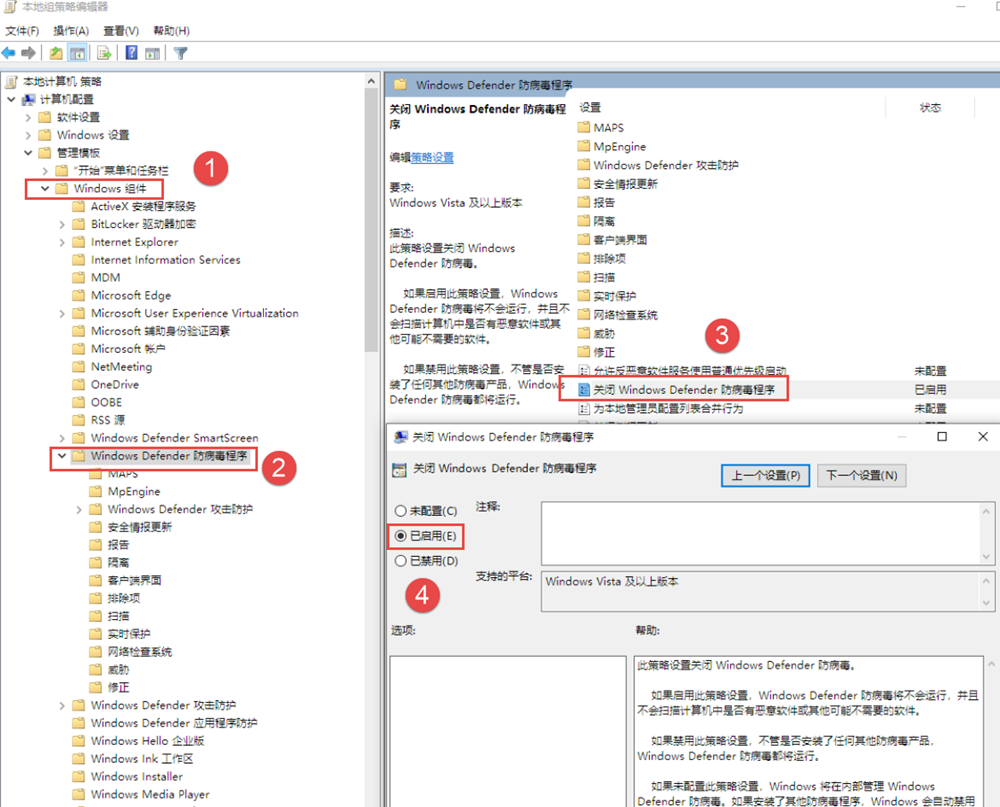 在gpedit.msc策略中将关闭防病毒给关掉