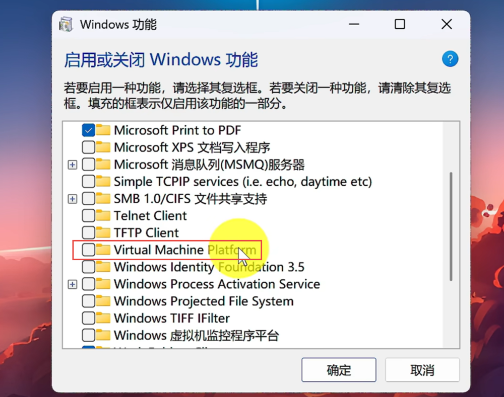 打开电脑中的windows功能,打开Virtual Machine Platform