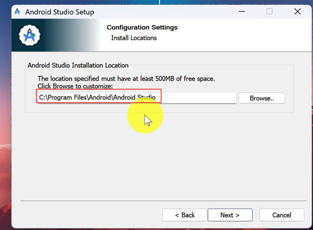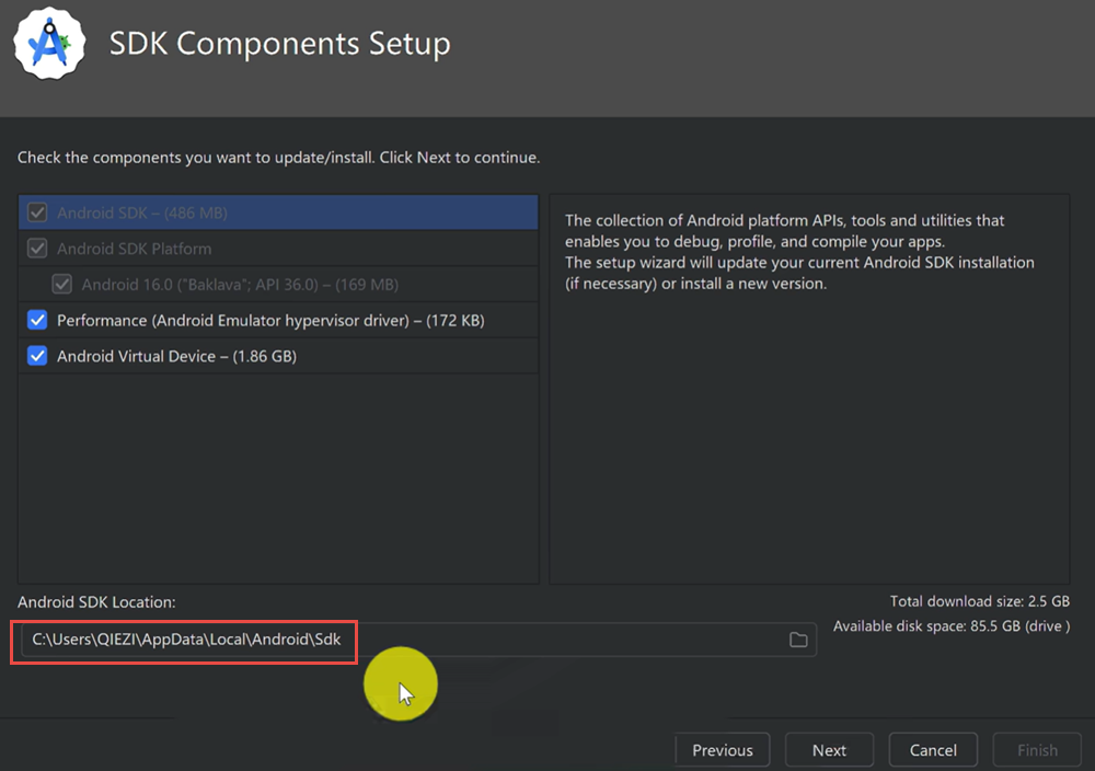 这个SDK安装路径需要修改一下,因为它会占很大的空间;它用来存放所有安卓开发工具,虚拟机系统镜像和平台文件的地方。建议改到C盘以外的地方。本例是在D盘建了个AndroidStudio的文件夹,在这个文件夹中再新建一个sdk文件夹。
