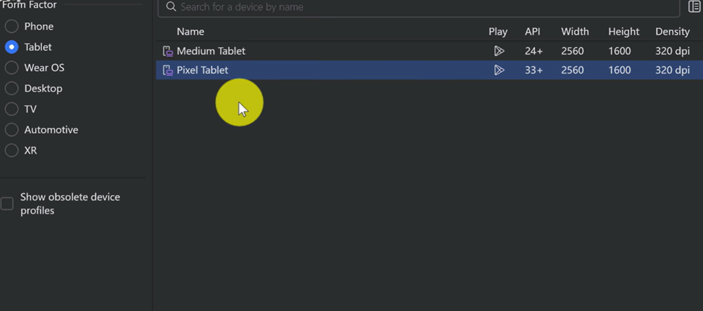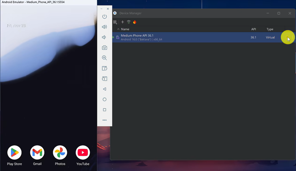 系统默认虚拟了一台手机,点击右侧的运行就可以启动这台手机。如果想再创建一台,占左上角的加号。