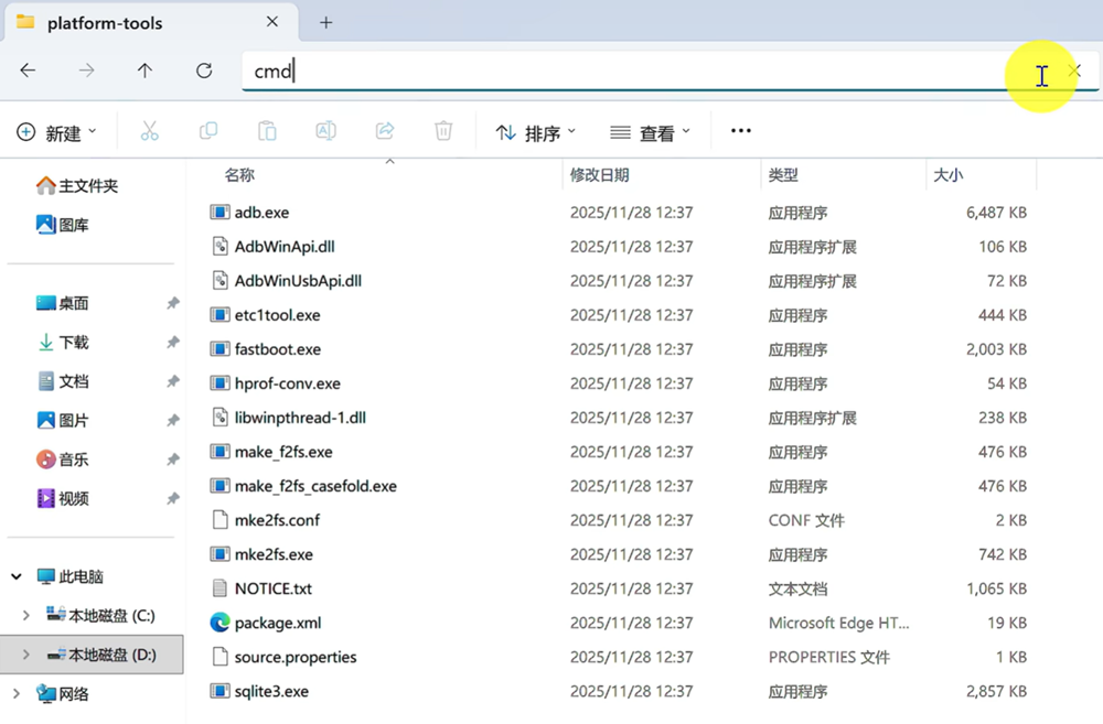打开DE:\AndroidStudio\sdk\platform-tools`路径,并输入cmd