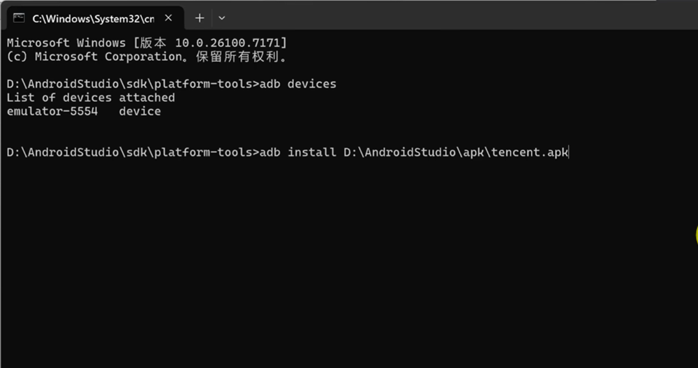此时输入adb devices,回车;看到emulator-5554 device; 显示已连接设备列表;此时使用adb install 进行安装apk软件;