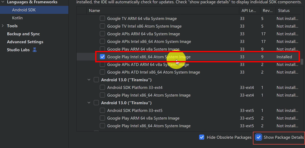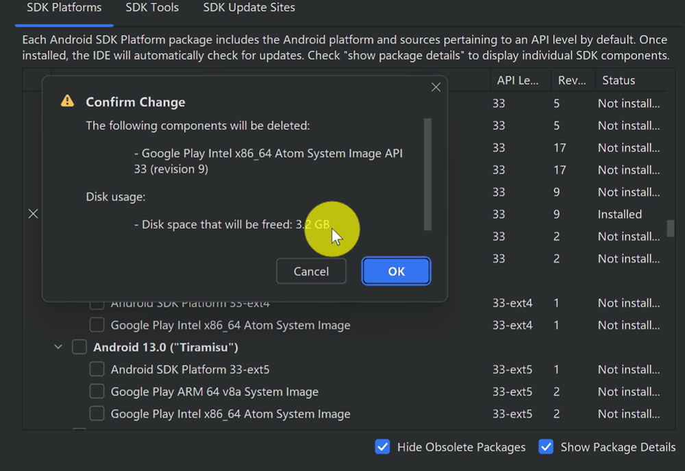 不过上面的方法是不会删除掉系统安装包。可以进入AndroidStudio主页——More Actions——-SDK Manager——–找到要删除的系统,这是自动下载的文 件,把前面的勾选去掉,点应用即可。