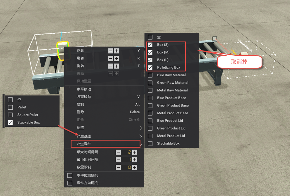 - 对产生工件的器件,一般设为间隔一秒产生一个工件即可。将产生零件都取消掉,只需勾选产生基座的最后一个选中即可。