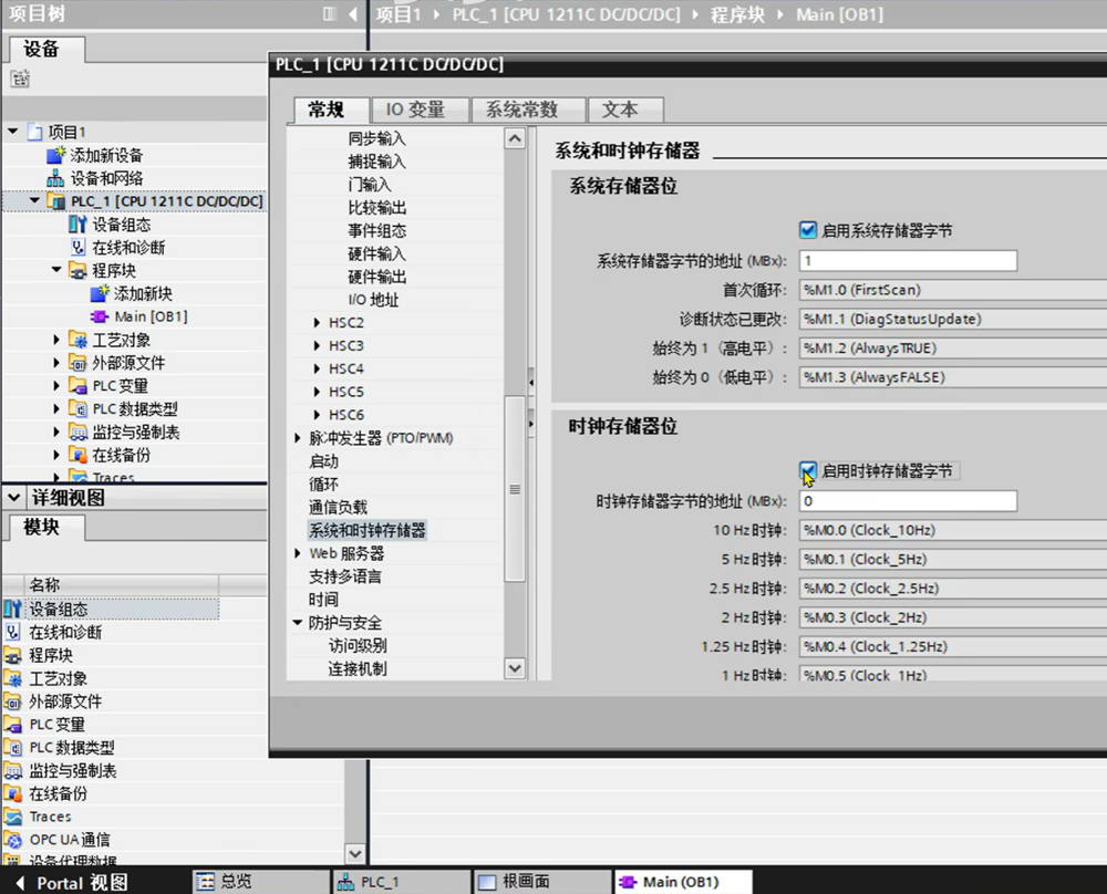 将开博图新建一个项目并组态一个PLC,本例以1200为例,打开系统和时钟存储器。
