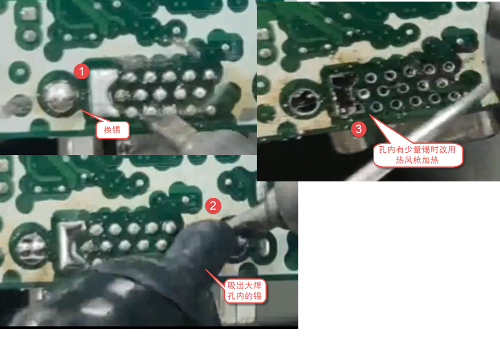 3、当有有少量锡在焊孔内时可以用热风枪来辅助,等全部熔化后可以将VGA夹出;