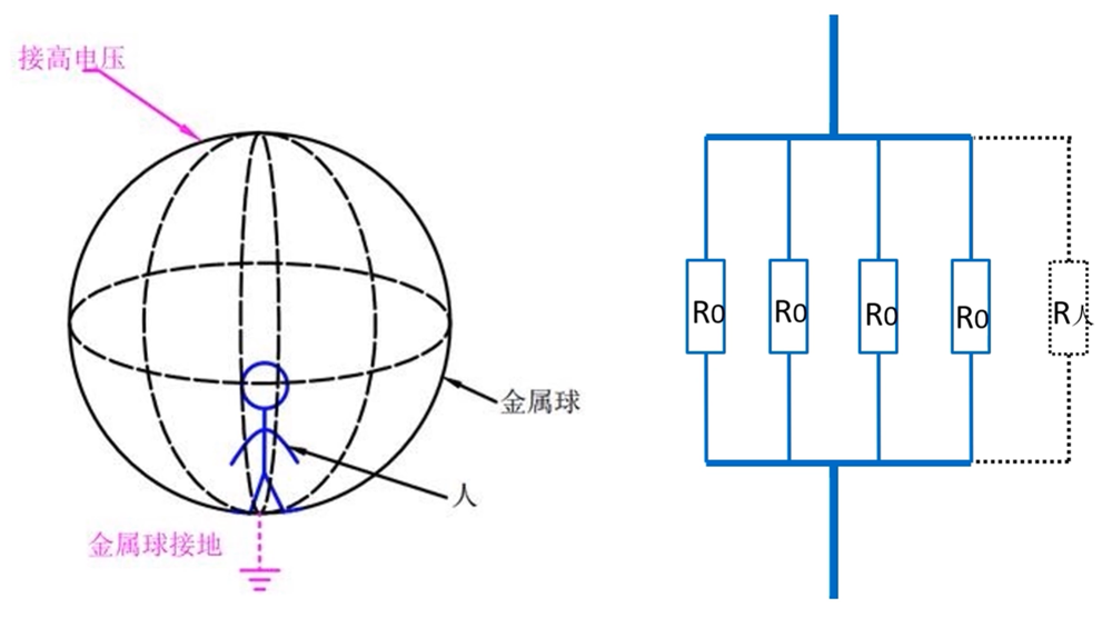 下面以人在金属笼内对其进行通电做为试验,此时人是不会触电,是因为人体电阻远远大于金属的阻值,根据并联电路的原理,电流不会从人体经过。