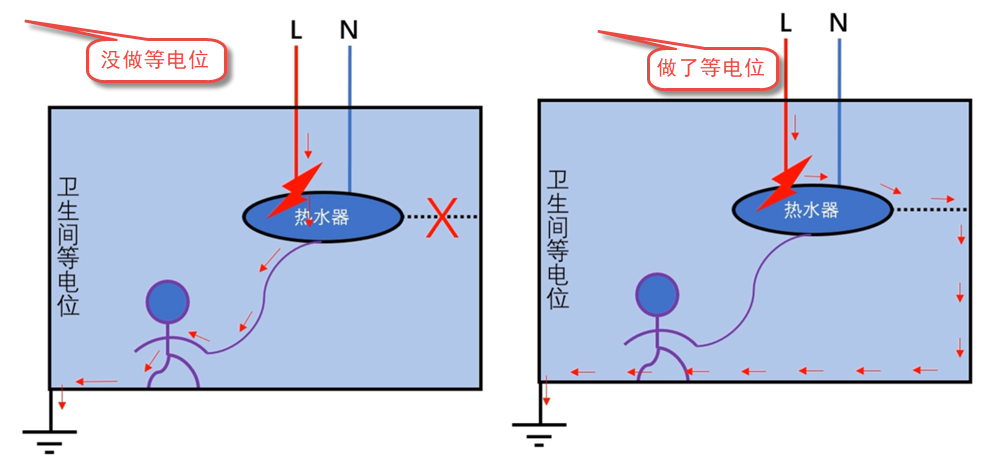- 卫生间的火线不会与等电位连接在一起,否则的话不是漏电了吗。