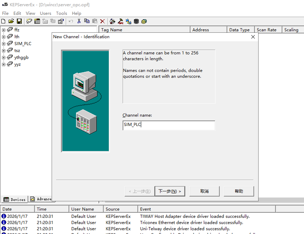 ◆ 首先为添加仿真的通道命名如:SIM_PLC,在右侧的空白区右击新建通道;