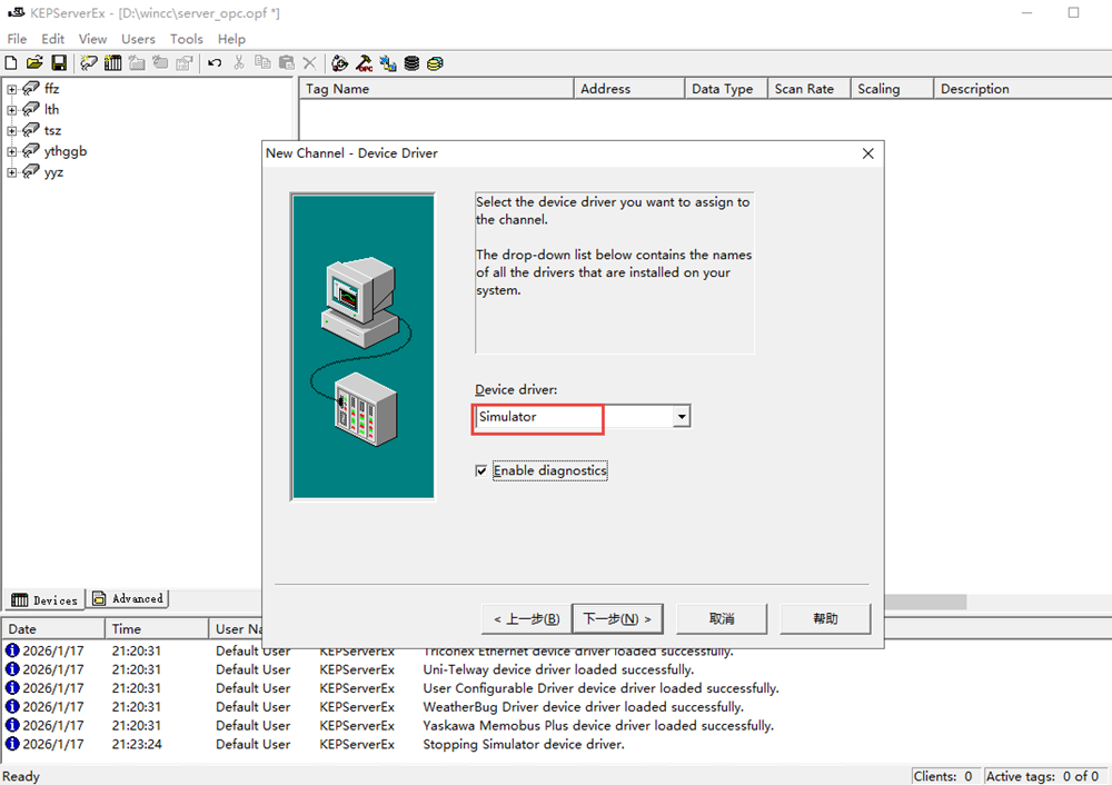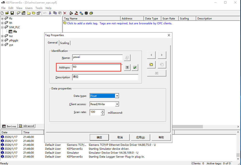 ◆ 驱动名称选择仿真Simulator,并勾选Item Persistence,KepServer 关闭时,会把:R0、R1、R2… 的当前值存起来,下次打开时,再恢复这些值。