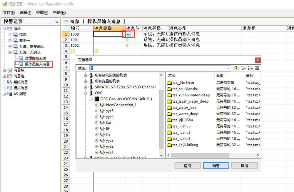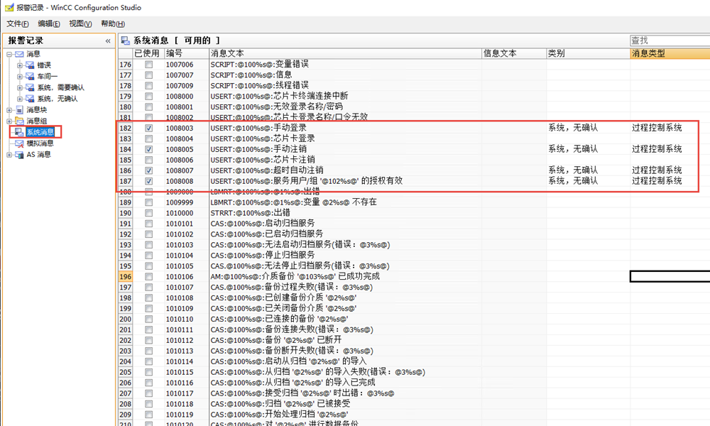 - 打开报警记录→消息组→系统消息→勾选手动登录、手动注销、超时注销等根据自己的需求;注:过程控制系统的消息类型是系统,无确认;