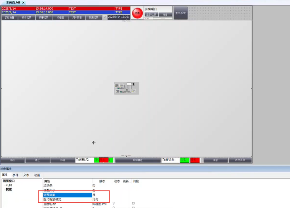 ◆ 因为一些主画面都是在画面窗口里进行切换的,所以只需要改画面窗口的一些设置就可以了。画面窗口的→属性→其它→调整画面改成是和画面缩放模式调成均匀。