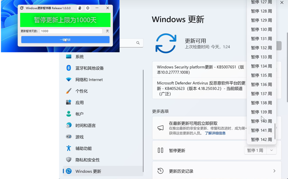 ◆ 通过修改暂停时间参数来实现无限期暂停更新;与其它软件不同的是它的操作是可逆的,当你想更新系统时,可以点继续更新。
