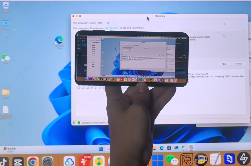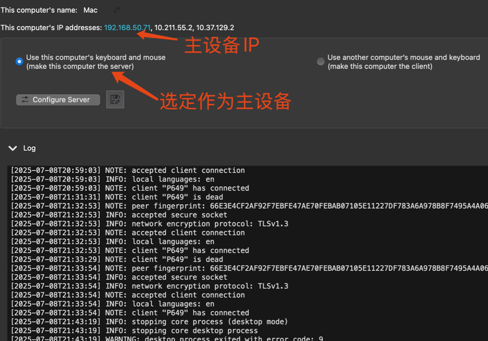- 使用方法很简单,两个设备都打开deskflow,然后其中一台选择主ip地址,