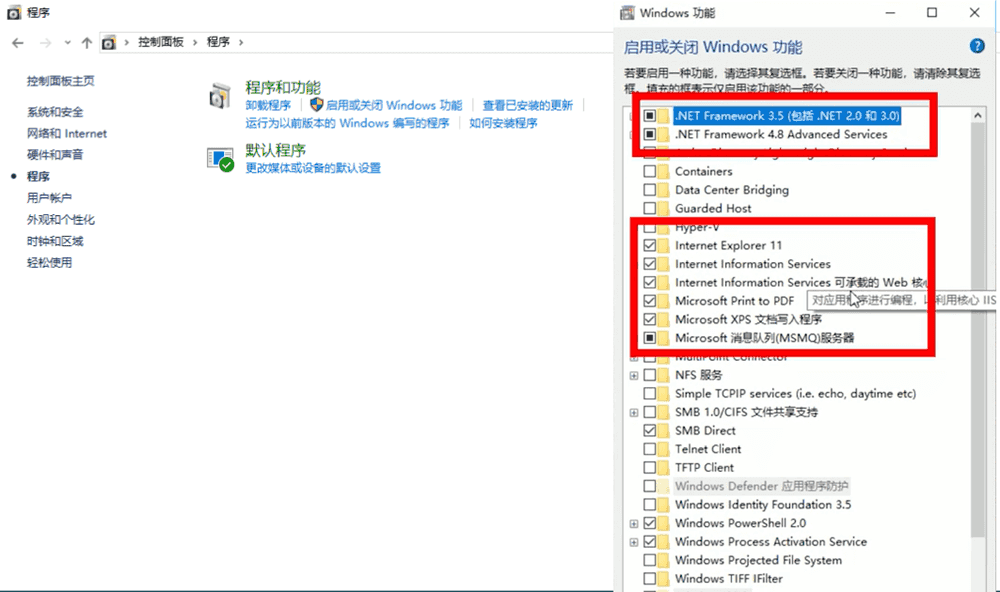 首先打开控制面板,找到程序和功能,选择启用或关闭 Windows 功能。