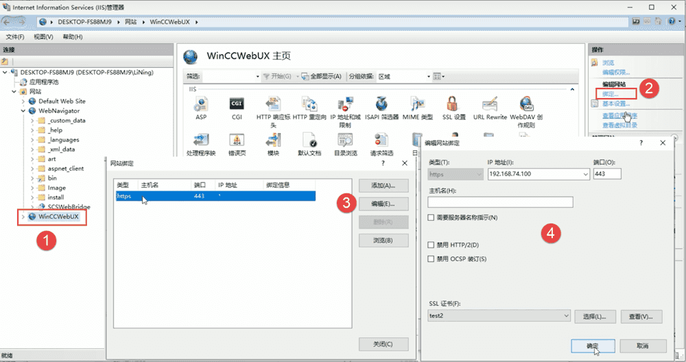 打开 IIS 管理器,确认 WebNavigator 和 WinCCWebUX 项已存在。检查绑定的 IP 地址,WebUX 可能需要手动添加绑定。