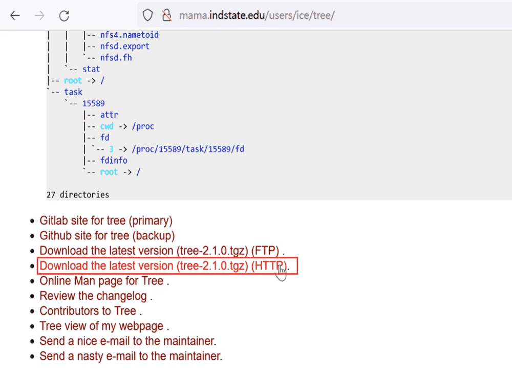 2、打开上面的`http://mama.indstate.edu/users/ice/tree`,找到下载地址后右键复制链接;在linux窗口`wget http://mama.indstate.edu/users/ice/tree/src/tree-2.1.0.tgz`进行下载;