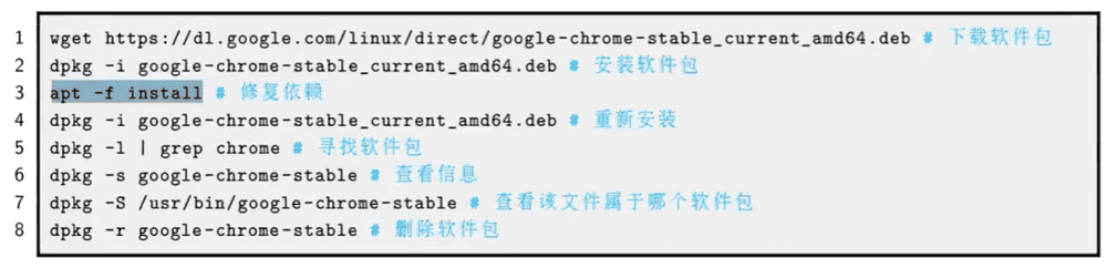 常见的包管理软件有apt, yum/dnf, pacman, zypper等