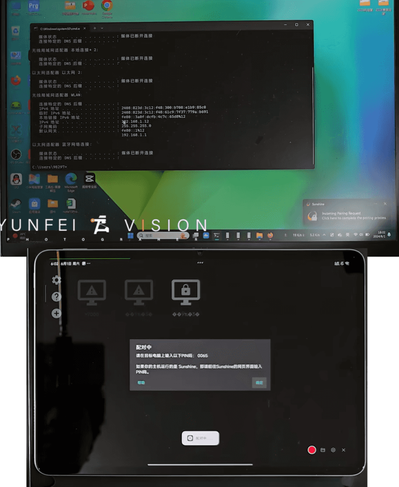 进入电脑中 Sunshine 的后台,这里面有个 PIN 码;输入 0065,然后这就成功了。点击 desktop 进行连接;