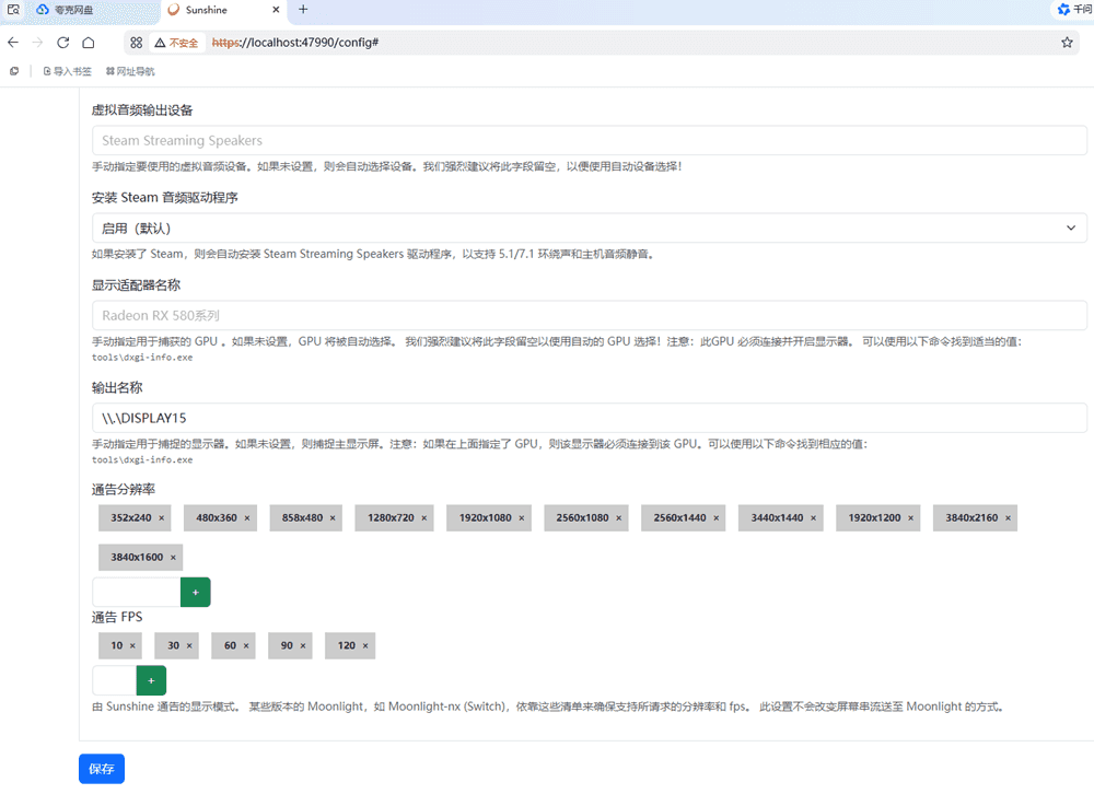 在 Sunshine 中点 配置—–声音和视频 的输出名称填写 \\.\DISPLAY15,然后保存并应用;