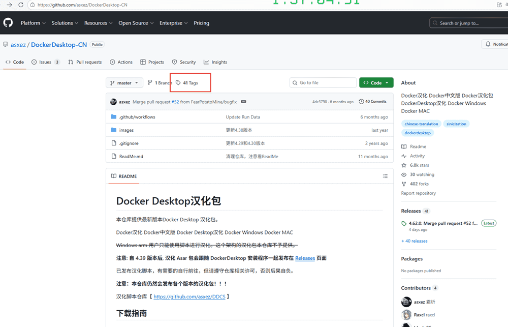 在 github 里有个 docker desktop 的汉化包;选中 Tags 标志,