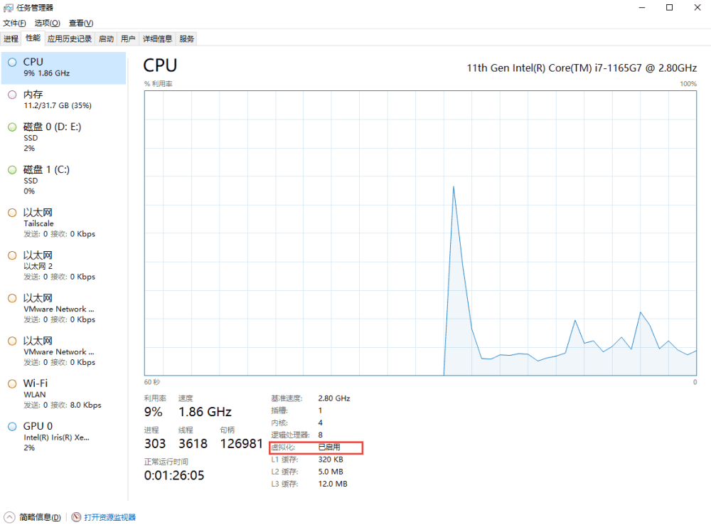 - 查看电脑是否打开了虚拟化;查看任务管理器的 CPU 中的虚拟化是否打开;是一定要开启的。大多数电脑默认都是开启的;