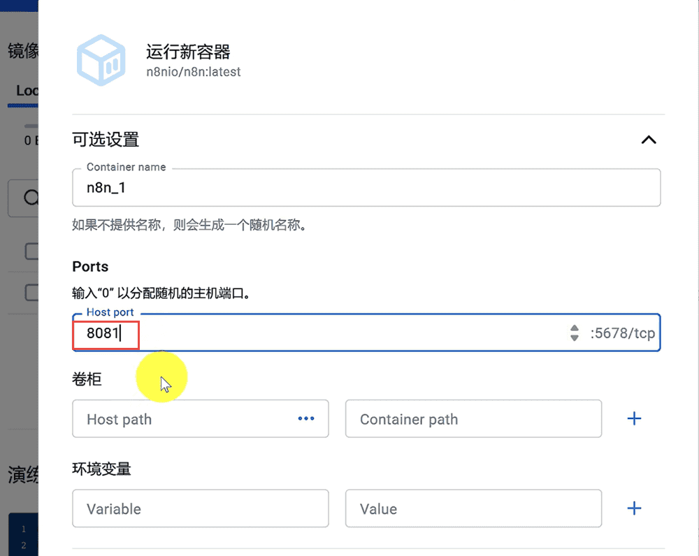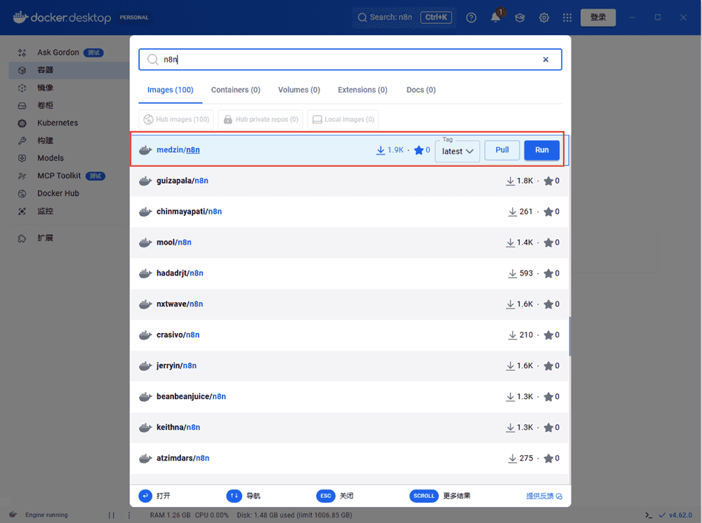 在搜索栏中直接搜索需要的软件 如:n8n 其中 pull 是将镜像下载到本地,run 是把镜像下载到本地后进接运行;pull 以后在镜像中就可以看到镜像了,直接点击运行也是可以的;