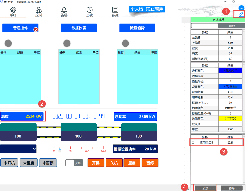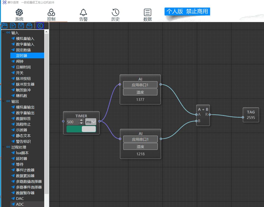 按制按钮,分别拖放输入中的AI、定时器、运行中的数字和、数据标签;这样就做出一个可以实时显示温度和湿度和的控制逻辑。