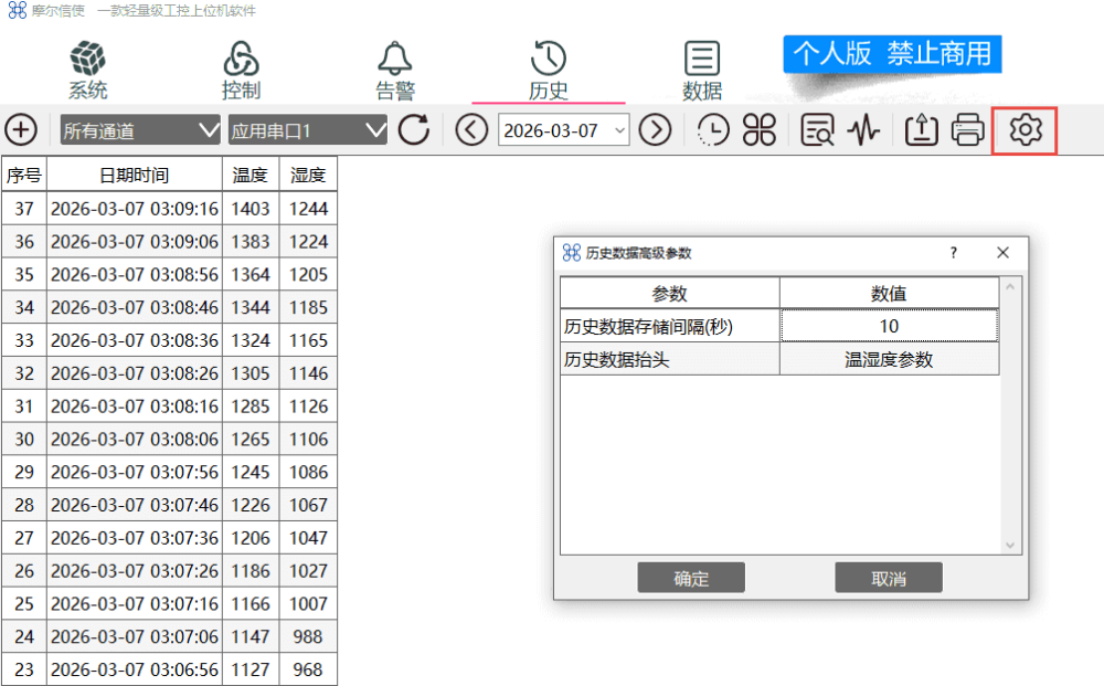 对于存储的间隔时间和抬头,可以通过历史数据高级参数来设定。