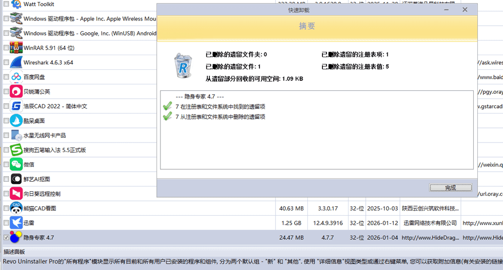 随便卸载一个软件进行测试,安可以将注册表内的文件都卸载干净。