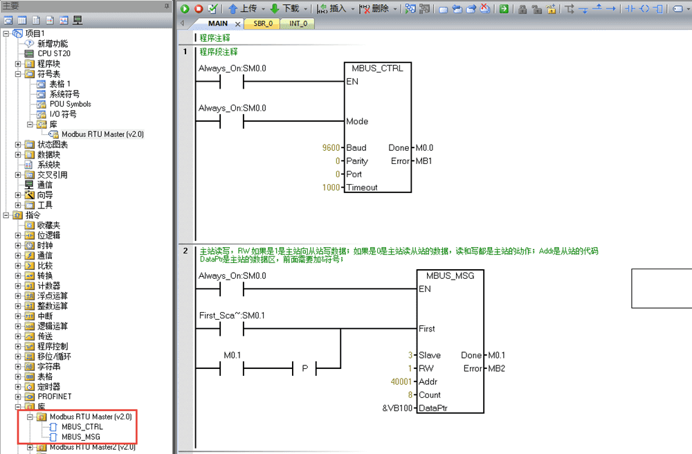 在200 smart中的代码编写,本示例200smar是作为Modbus RTU的主机的;摩尔信使作为modbus RTU的从站。